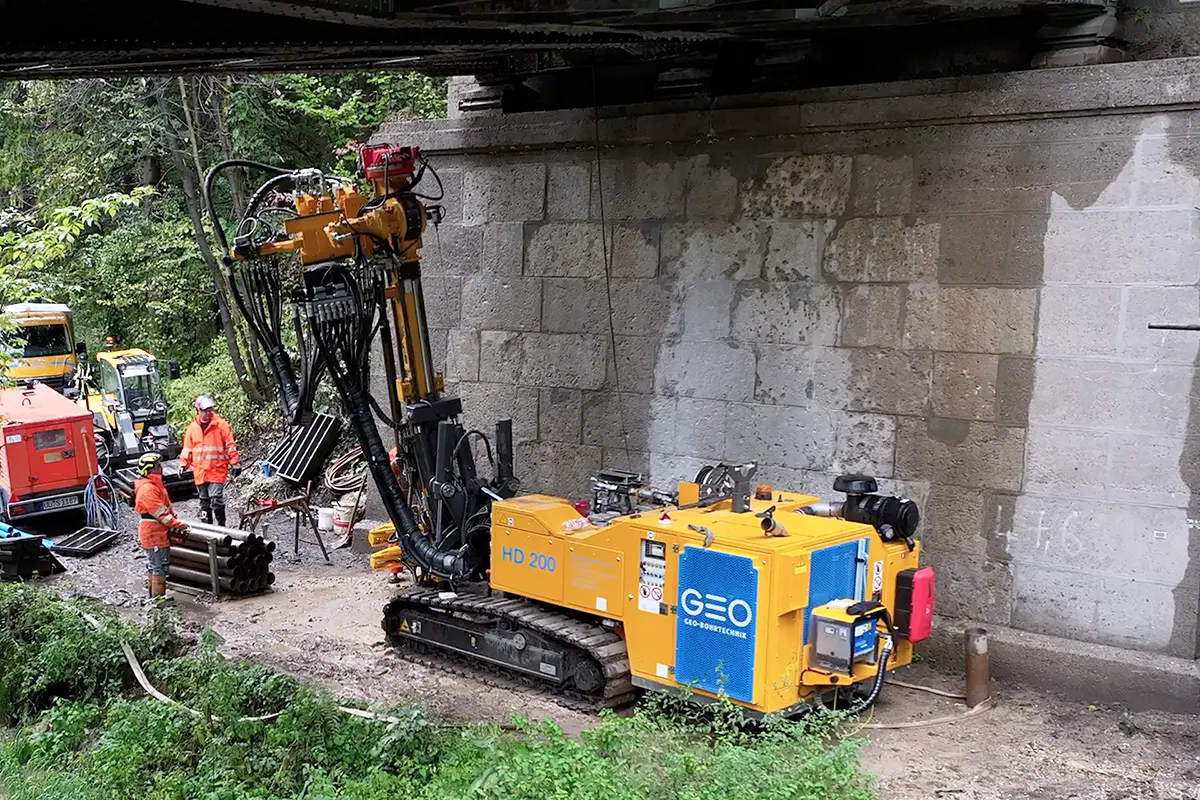 Nach der Auswertung der Tomografie werden gezielt verkarstete Schwächezonen ermittelt und Kernbohrungen mit bis zu 100 m Tiefe schräg unter die Widerlager abgeteuft. Darüber hinaus werden Bauwerkssubstanzbohrungen schräg durch die das Widerlager zur Erkundung der Gründungssohle sowie Grundwassermessstellen erstellt.