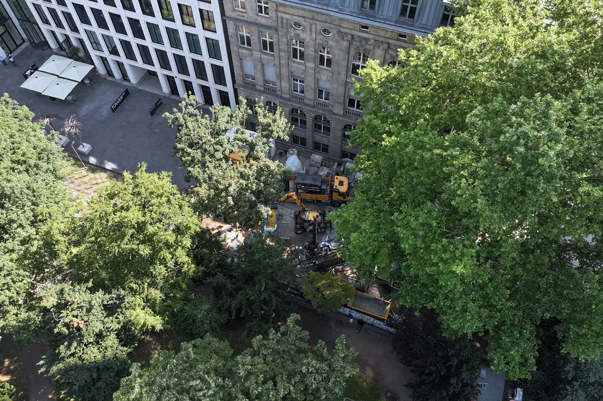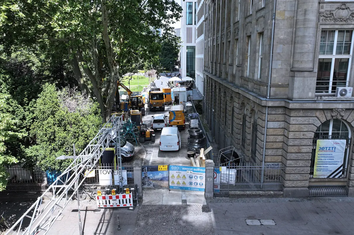 Die Arbeiten fanden im Innenhof unmittelbar an der Gallusanlage statt – mitten im dicht bebauten Bankenviertel. Die räumlich eingeschränkte Baustelle erforderte ein hohes Maß an exakter Logistik und technischer Planung. Geräte, Messtechnik und Materialtransporte mussten so organisiert werden, dass der laufende Stadtverkehr und die Nachbarbebauung nicht beeinträchtigt wurden.